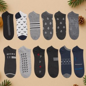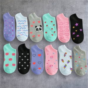 Docena de medias tobilleras con diseños variados, cómodas y resistentes para el uso diario.