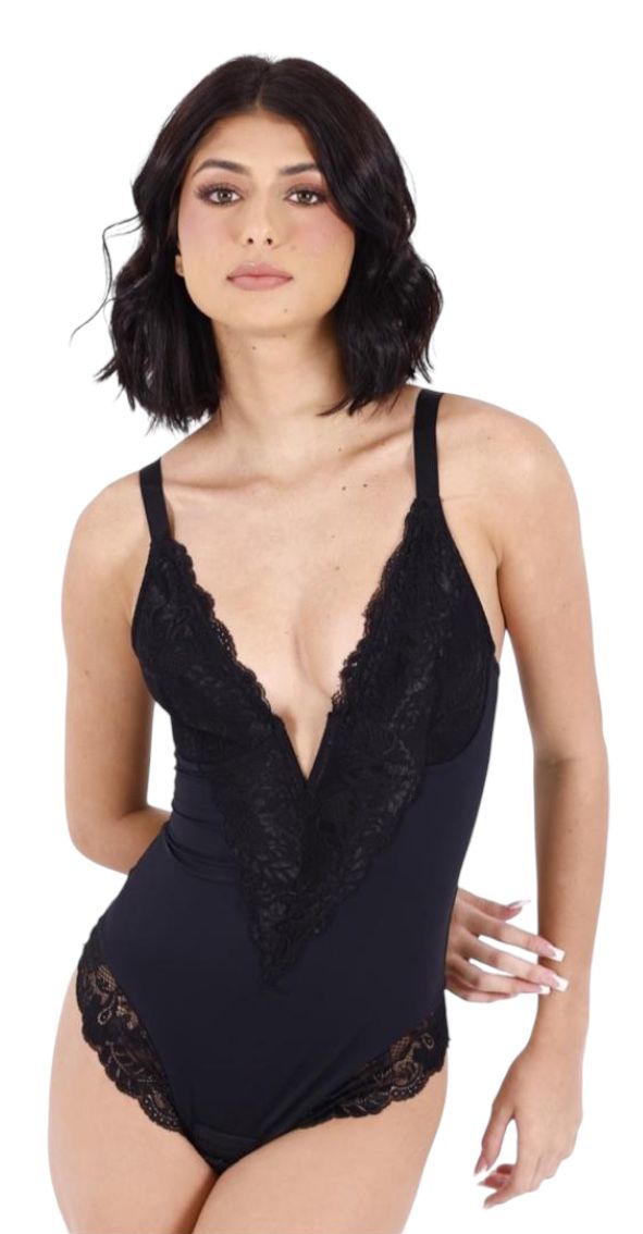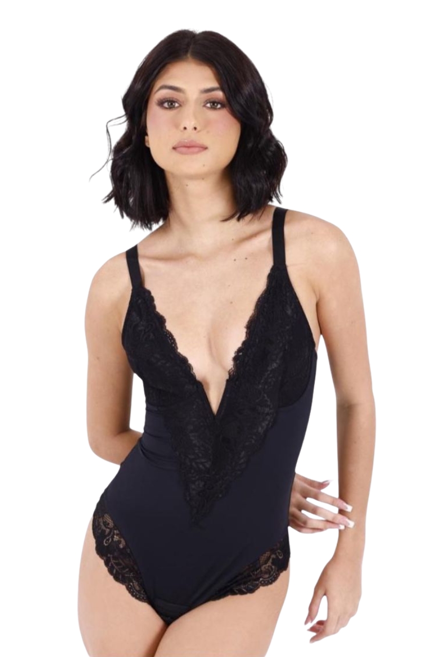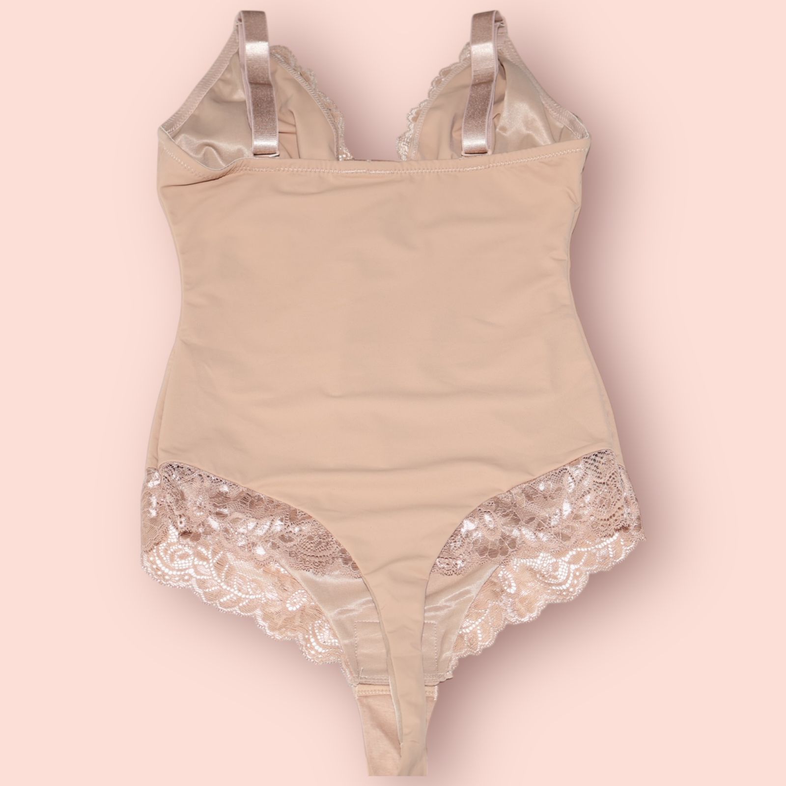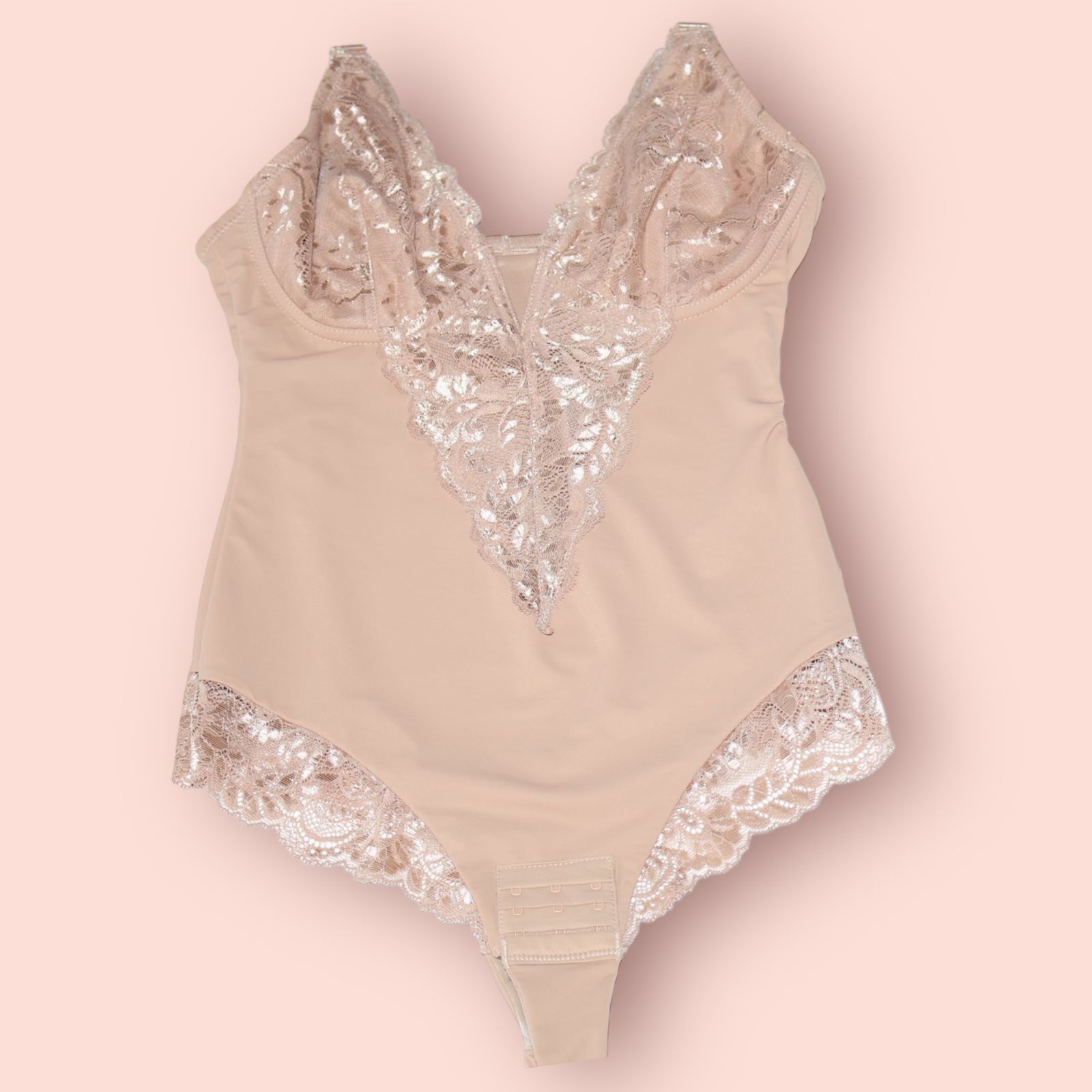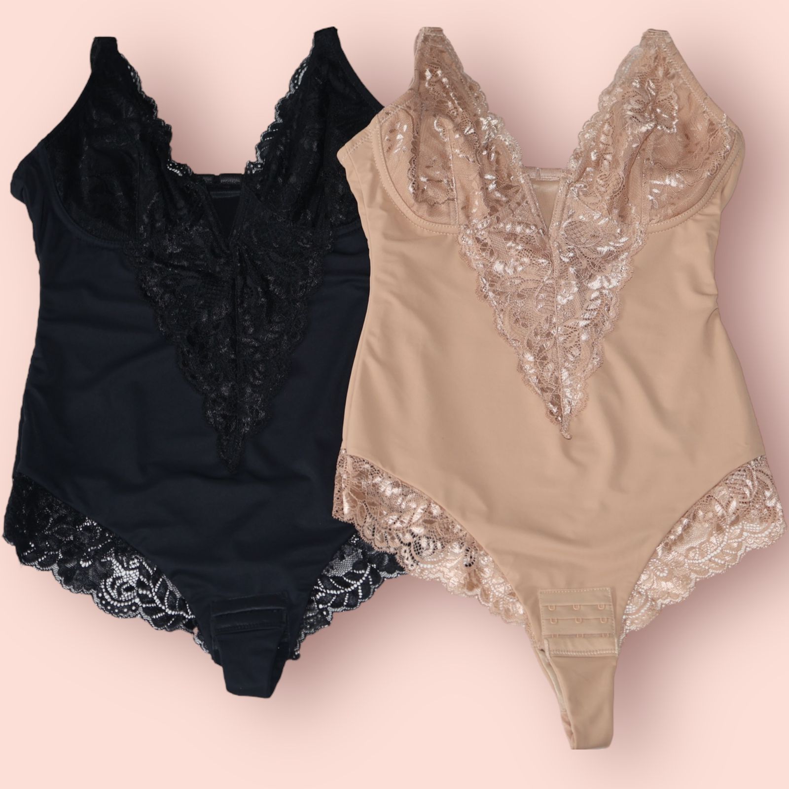 Body faja con escote profundo y detalles de encaje, diseñado para moldear la figura y resaltar la silueta con un toque elegante y sensual.