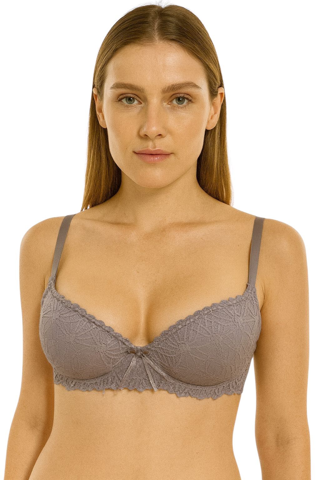 Brasier de encaje gris con copas realzadas, tirantes ajustables y lazo decorativo al frente. Elegante, cómodo y femenino.