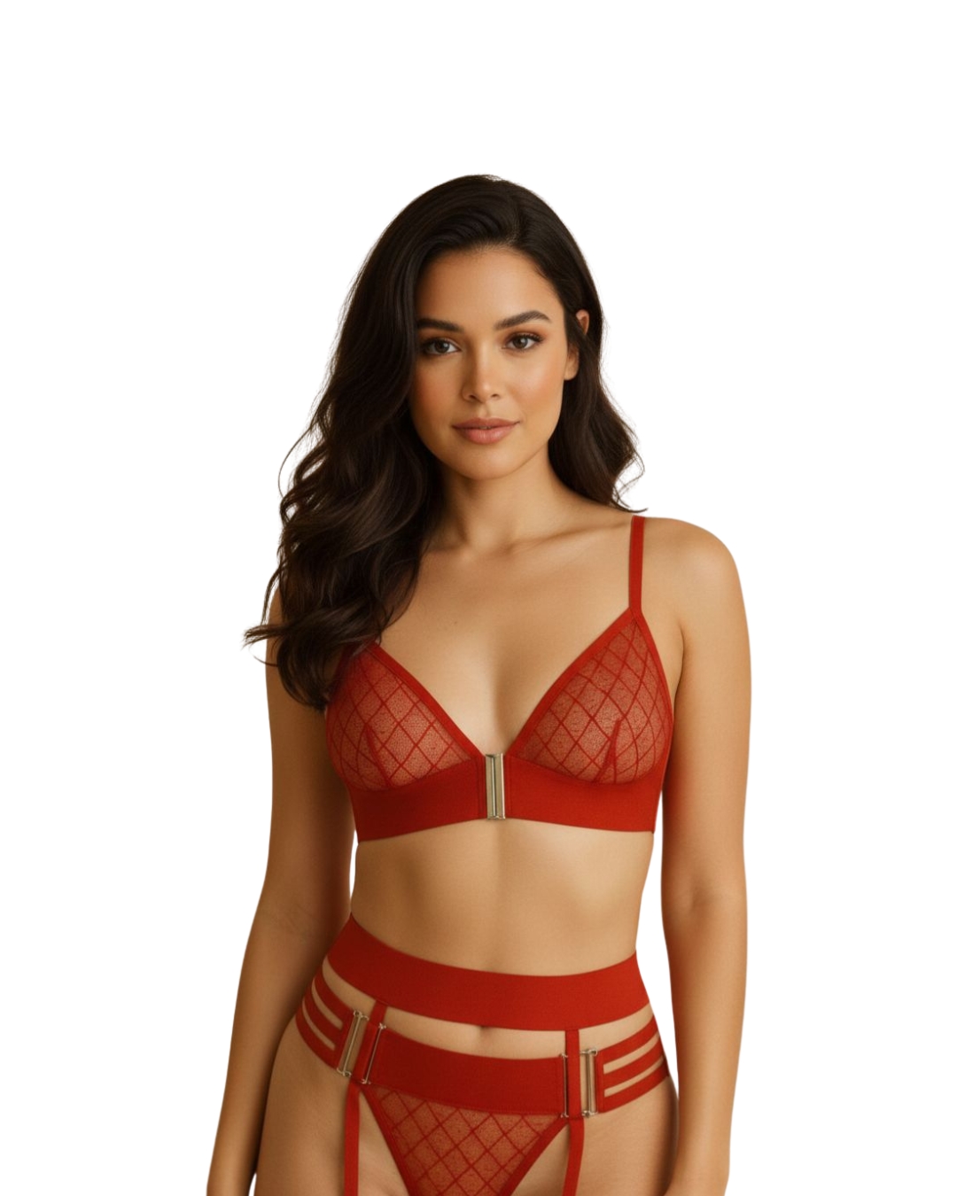 Este conjunto de lencería ha sido diseñado para resaltar tu silueta con un toque atrevido, elegante y contemporáneo. Sus transparencias sutiles crean un efecto visual cautivador, aportando sensualidad sin perder sofisticación.