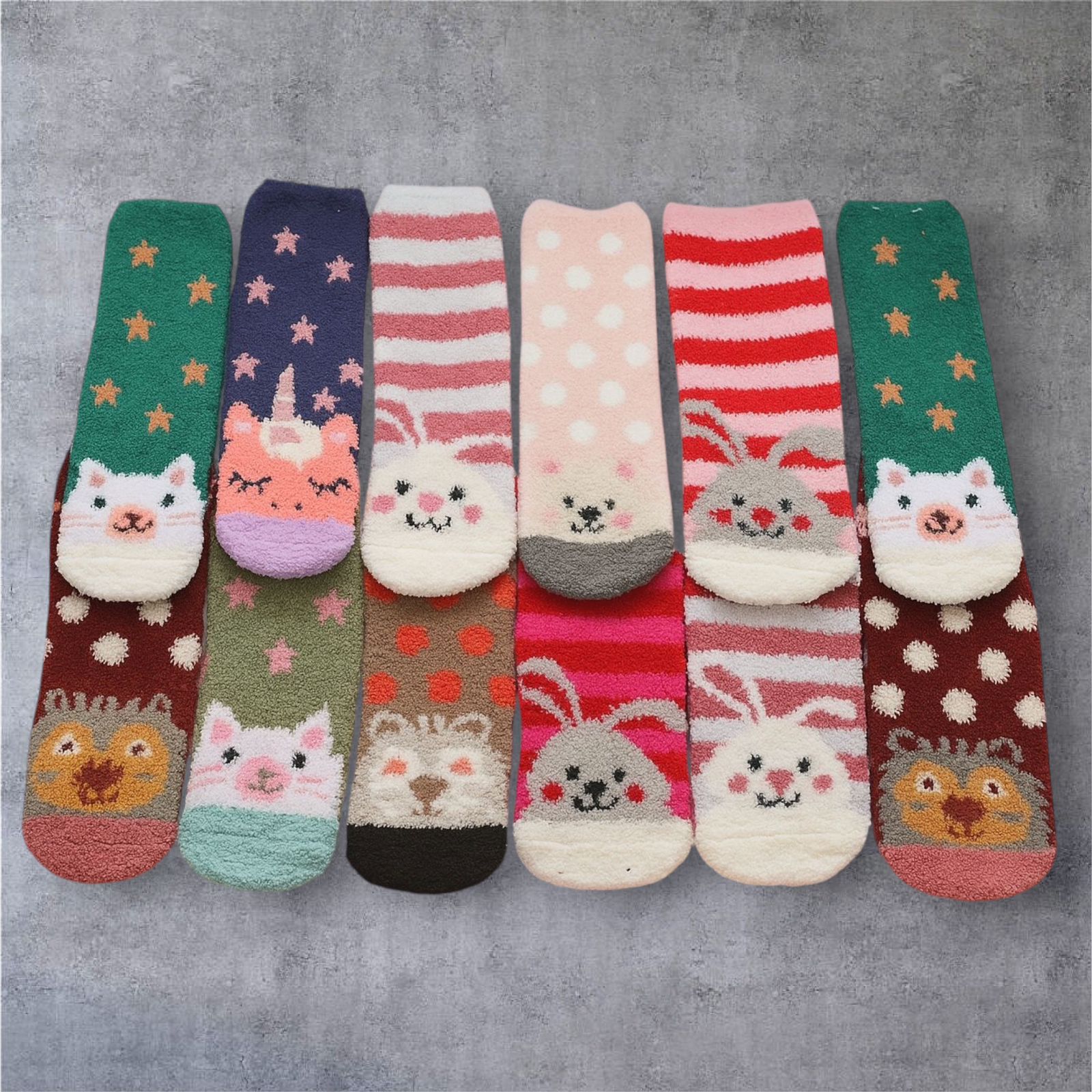 Medias afelpadas con diseño de gatito y detalles decorativos, ideales para mantener los pies abrigados y cómodos.