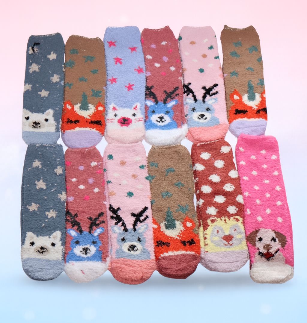 Medias afelpadas con diseños divertidos de animalitos, suaves y abrigadoras.