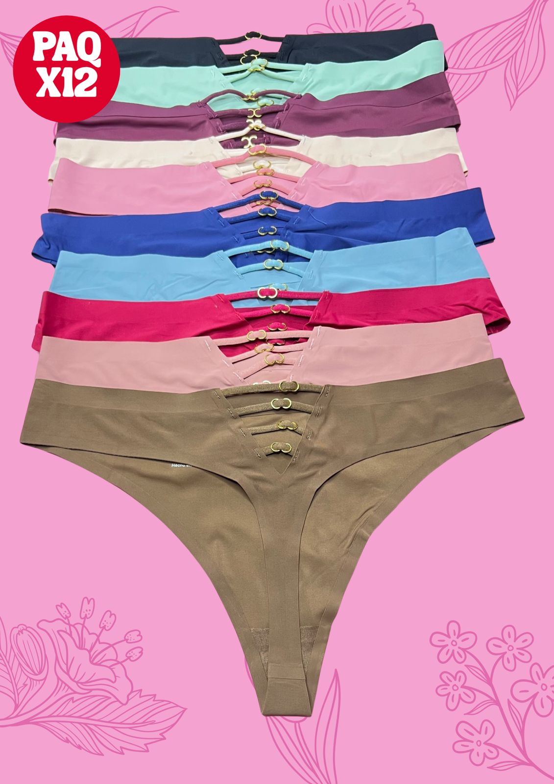Paquete cerrado de 12 blúmer tipo tanga con detalle frontal de tiras y aros metálicos, tela suave y elástica en tonos surtidos.