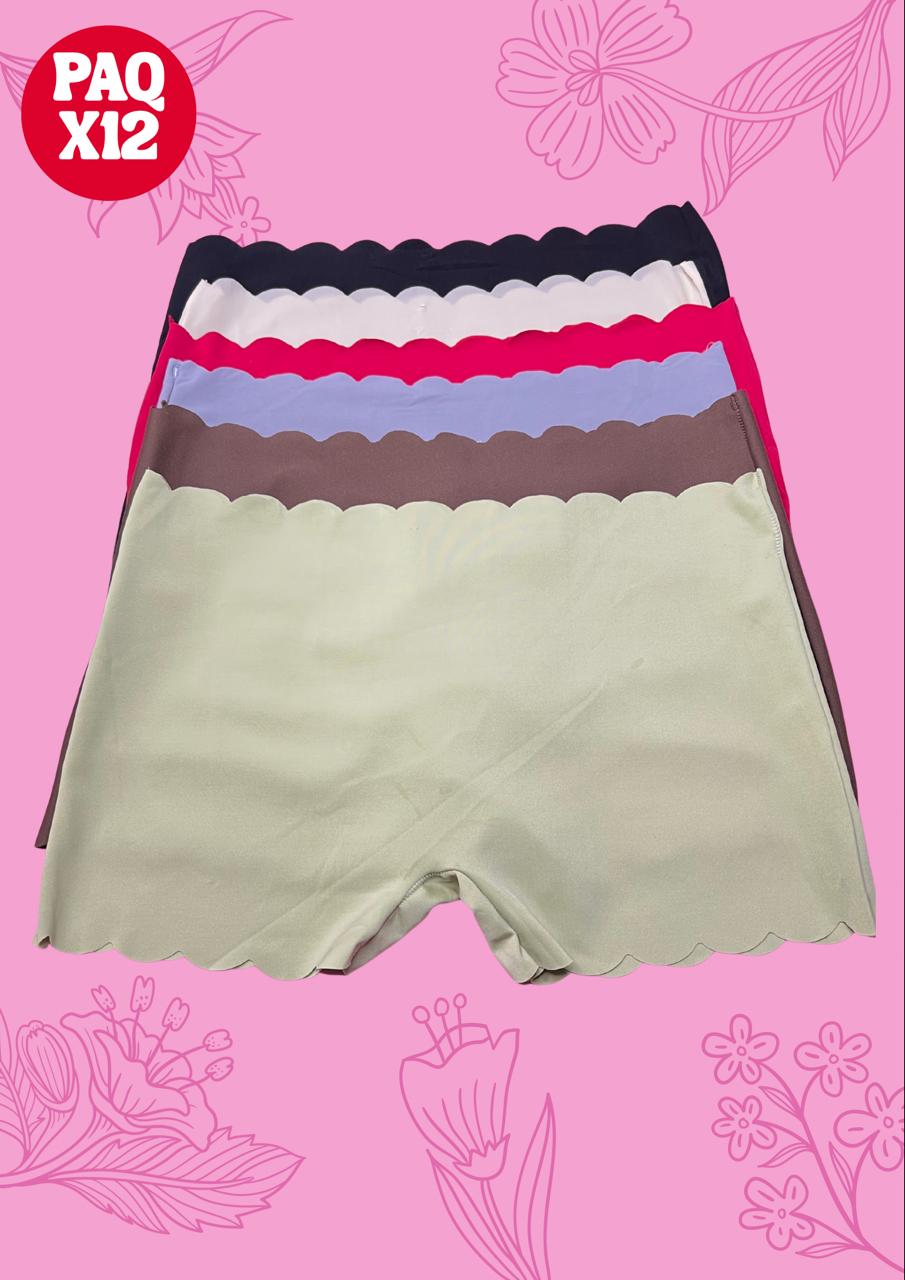 Paquete cerrado de 12 short-blúmer sin costuras, con bordes ondulados y tonos surtidos.