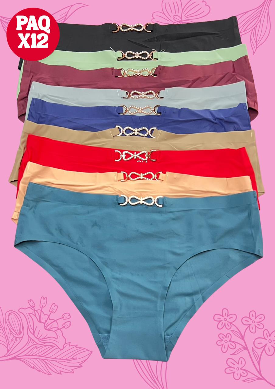Paquete cerrado de 12 blúmer sin costuras con adorno metálico al frente y tonos surtidos.