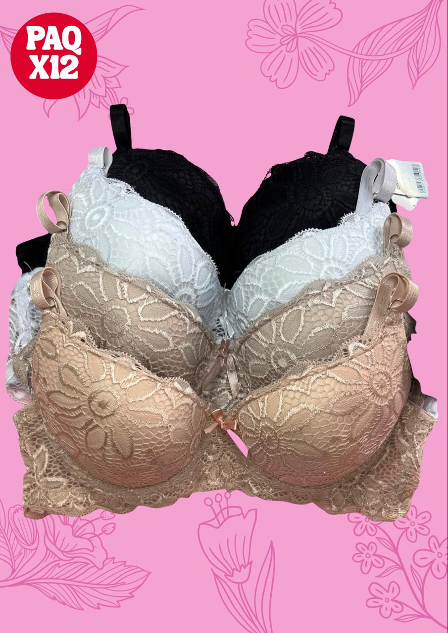 Paquete cerrado con 12 brassieres de encaje en varios tonos neutros, organizados en una bolsa plástica transparente.