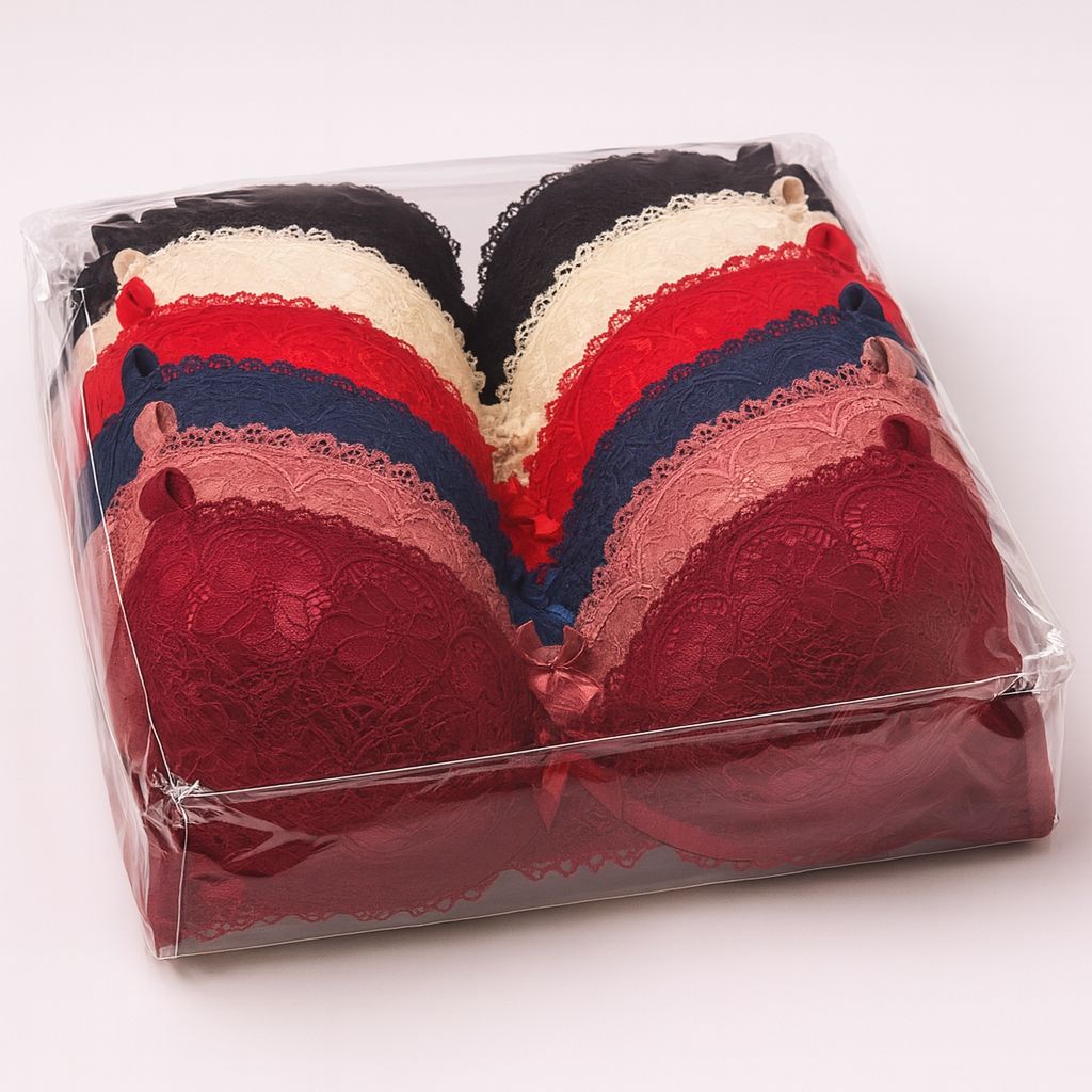 Este paquete cerrado incluye 12 brassieres con un delicado acabado de encaje que aporta un estilo femenino, atractivo y de alta calidad. Cada pieza cuenta con copas moldeadas que brindan soporte cómodo y una forma favorecedora, ideales para el uso diario.