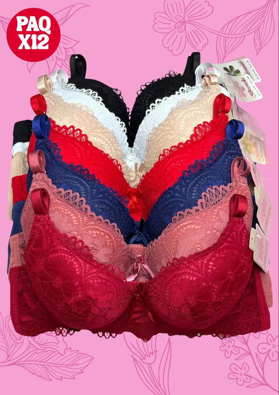 Paquete cerrado de 12 brassieres con encaje elegante, excelente soporte y presentación profesional lista para venta al por mayor o catálogo.