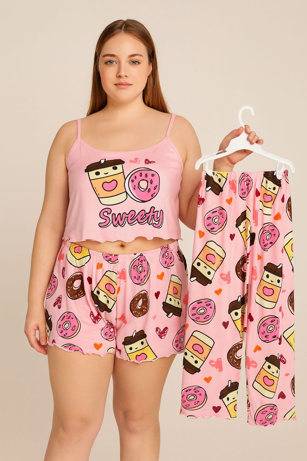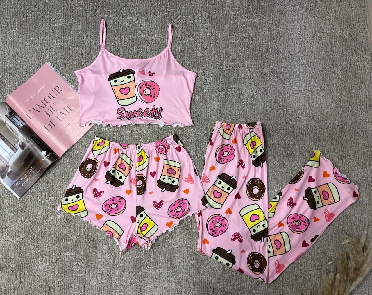 Encantadora pijama de tres piezas con diseño “Sweety”, ideal para quienes aman la comodidad y los estampados dulces. Incluye top corto de tirantes finos, short y pantalón largo a juego, todos con un adorable estampado de donas, cafés y corazones. Confeccionada en tela suave, ligera y transpirable que brinda frescura durante la noche. Su estilo juvenil y tierno la convierte en la opción perfecta para relajarte en casa o disfrutar de un descanso lleno de confort y buen gusto.