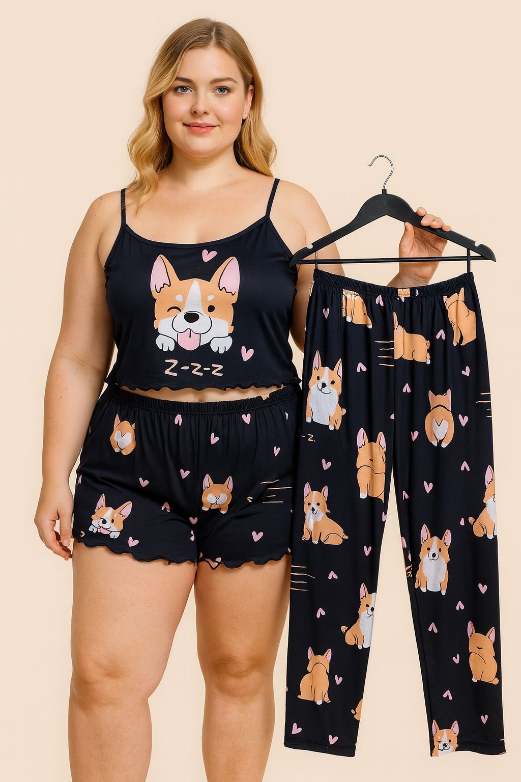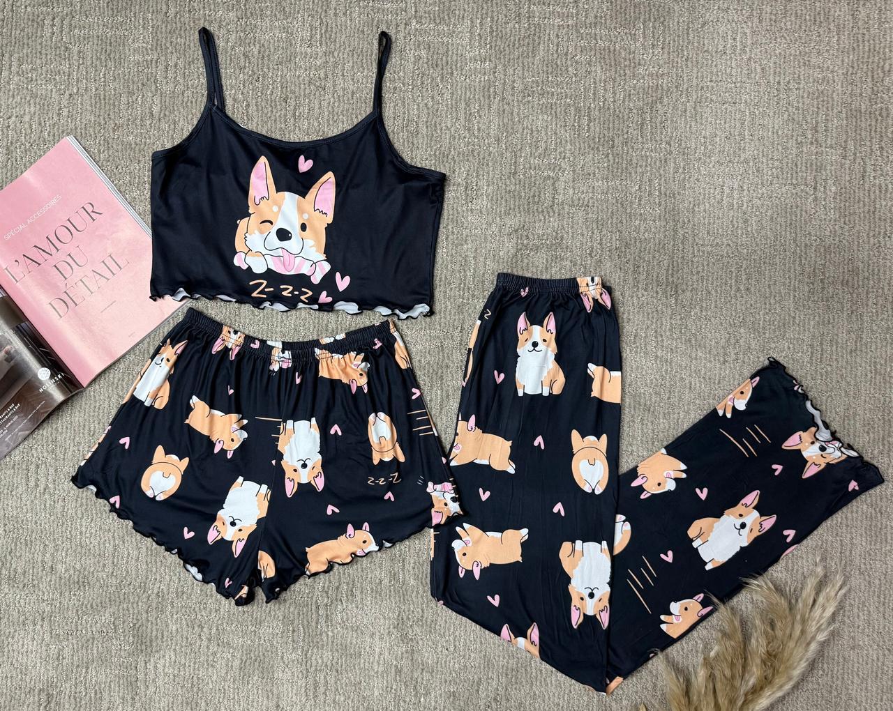 Dale un toque adorable a tus noches con esta pijama de tres piezas con estampado de perrito dormilón. Incluye un top de tirantes finos con diseño tierno, short y pantalón largo a juego, confeccionados en tela suave y ligera que brinda una sensación de frescura y confort. Su estilo juvenil y divertido la convierte en la opción perfecta para dormir o relajarte en casa con total comodidad.