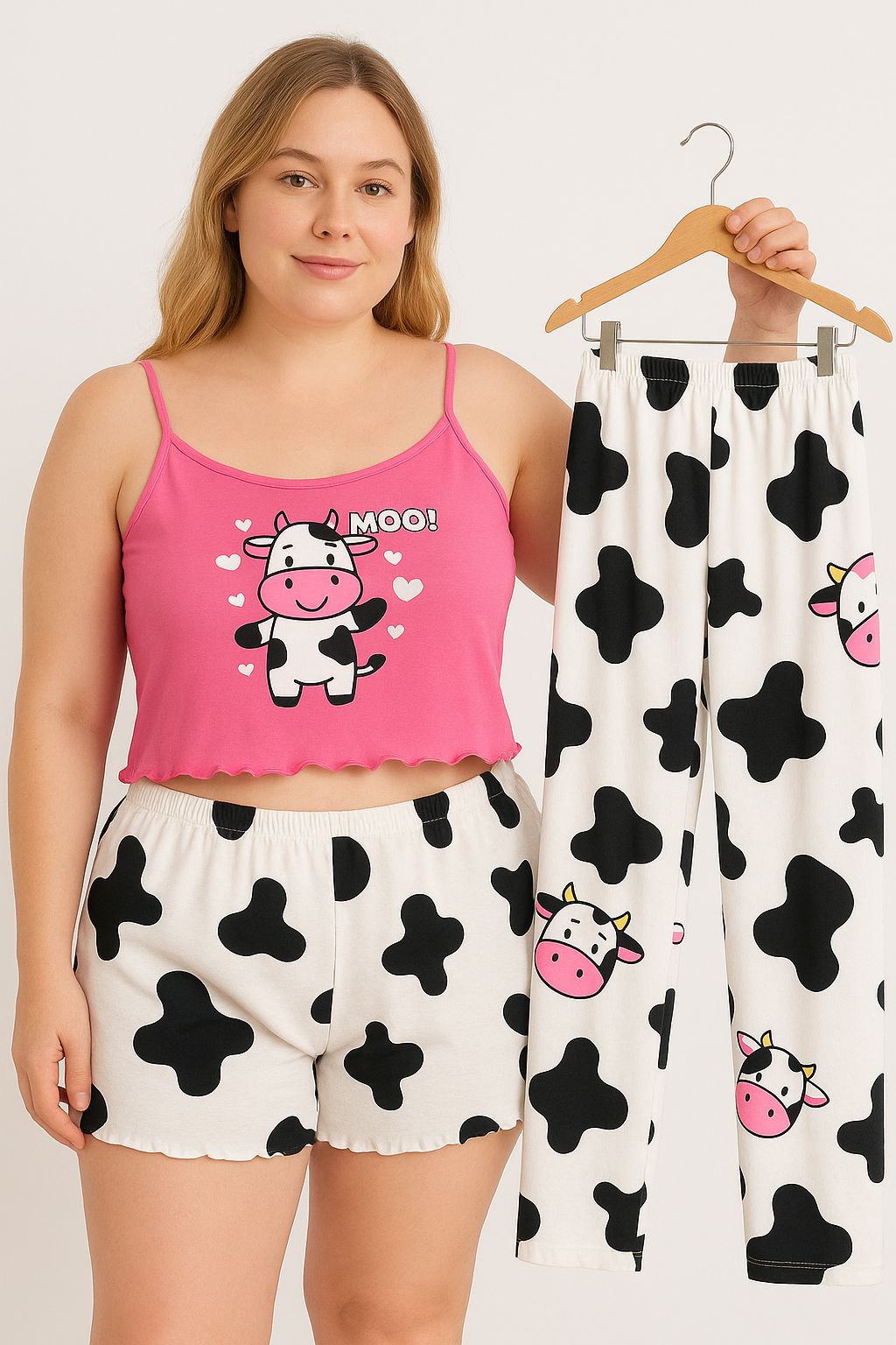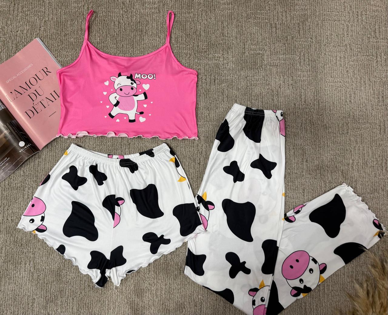 Esta encantadora pijama de tres piezas combina ternura y comodidad en un solo conjunto. Incluye un top de tirantes delgados con estampado de vaquita y la frase “Moo!”, además de un short y un pantalón largo a juego con divertidos detalles de manchas. Su tela ligera y fresca proporciona una sensación suave al contacto con la piel, ideal para dormir o relajarte en casa con total confort y un toque divertido.