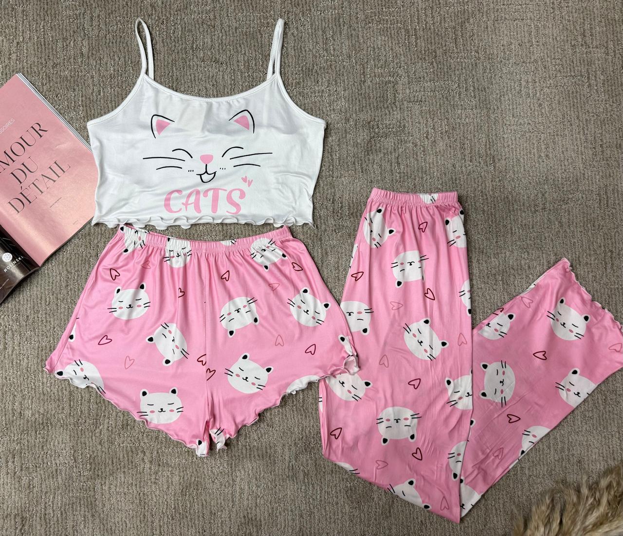 Pijama de trío con diseño adorable de gatitos y detalles de corazones, perfecta para quienes aman la comodidad y el estilo tierno. Incluye un top corto de tirantes delgados, un short y un pantalón largo con estampado a juego. Elaborada en tela ligera y suave al tacto, ofrece frescura y confort durante toda la noche. Ideal para relajarte o dormir con un look divertido y femenino, esta pijama combina dulzura y comodidad en cada detalle.