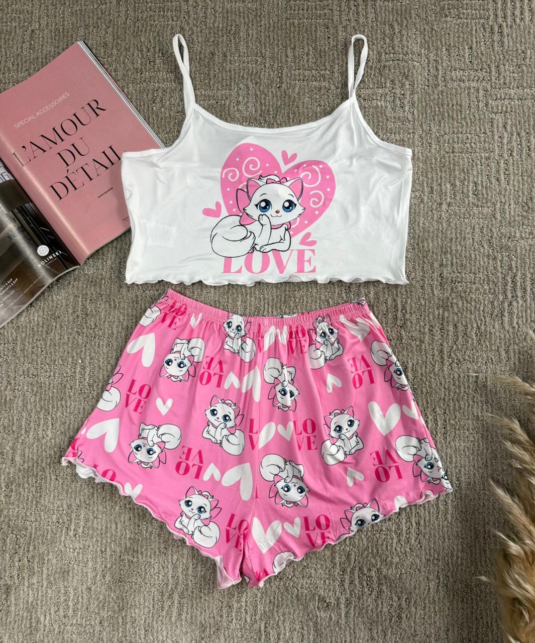 Adorable pijama de dos piezas que incluye un top corto de tirantes finos y un short con pretina elástica. Su diseño destaca por el encantador estampado de gatito rodeado de corazones y la palabra “Love”, que transmite dulzura y estilo. El top tiene un delicado borde ondulado que añade un toque coqueto, mientras que el short ofrece suavidad y frescura para un descanso confortable. Ideal para relajarse o dormir con un look femenino, cómodo y lleno de ternura.
