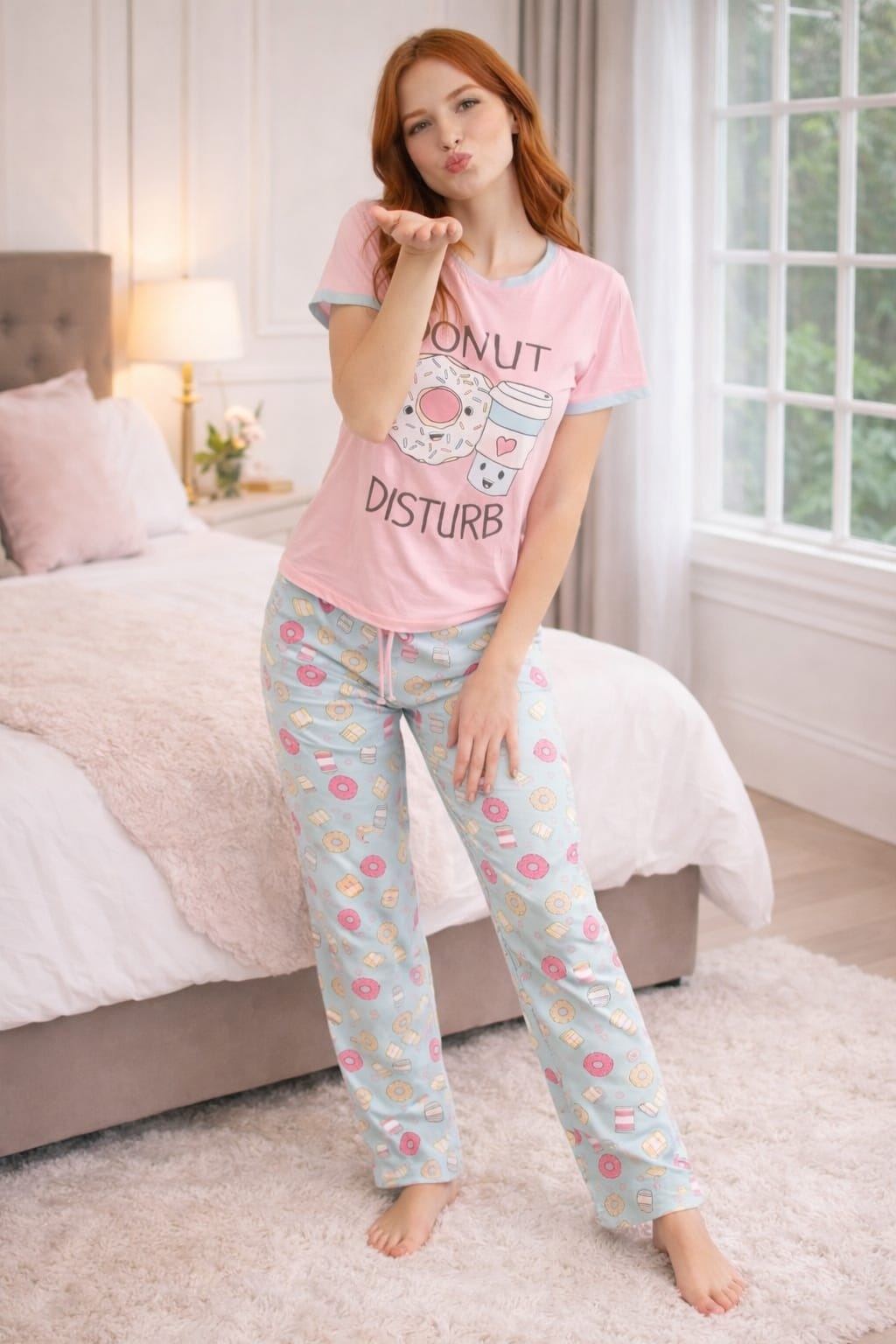 Pijama de dos piezas con camiseta rosa de manga corta con estampado “Donut Disturb” y pantalón azul con diseño de donas. Cómoda, suave y perfecta para descansar con estilo.