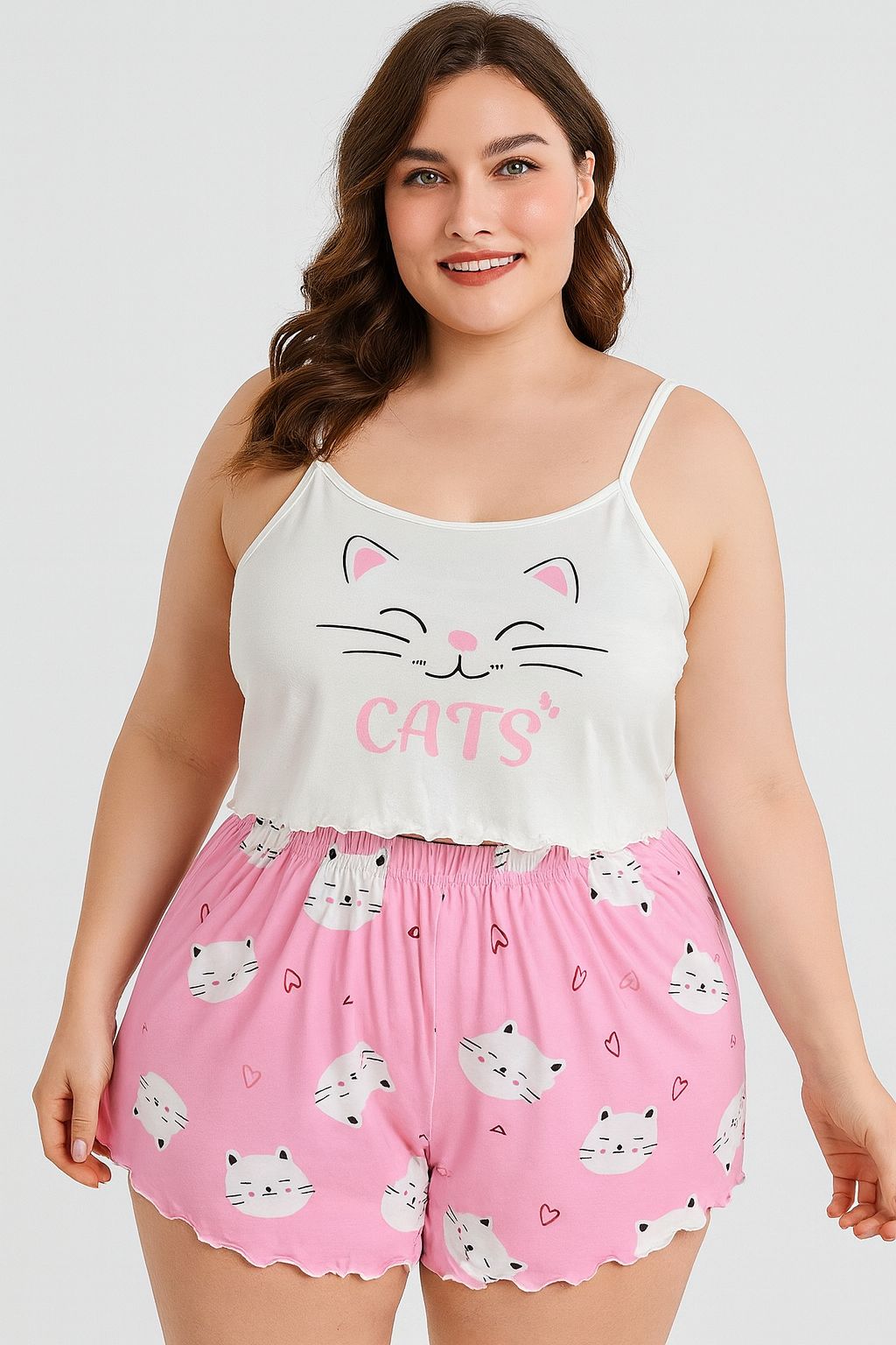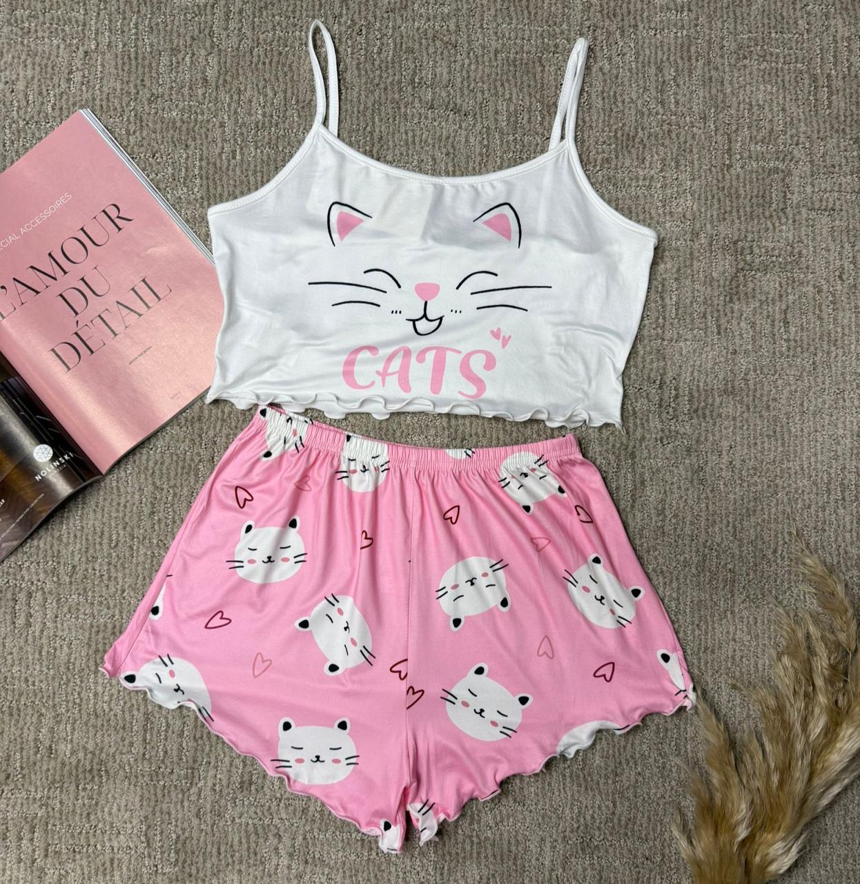 Linda pijama de dos piezas que combina un top corto de tirantes finos y un short con pretina elástica. El conjunto destaca por su encantador diseño de gatitos y corazones, con la palabra “Cats” en el frente del top, aportando un toque tierno y juvenil. Su tela suave y ligera garantiza comodidad durante toda la noche, mientras que el borde ondulado del top añade un detalle coqueto. Perfecta para dormir o relajarse con un look dulce y cómodo.