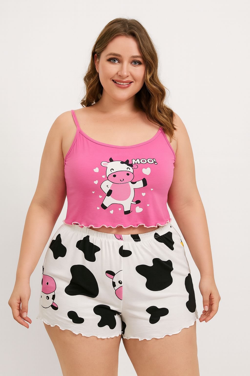 Tierna pijama de dos piezas compuesta por un top corto de tirantes finos y un short con pretina elástica. Su diseño destaca por el alegre estampado de vaquita y corazones, acompañado de la palabra “Moo!”, que aporta un estilo divertido y juvenil. El top tiene un delicado borde ondulado que le da un acabado coqueto, mientras que el short ofrece comodidad y frescura gracias a su tela ligera. Ideal para descansar o relajarse con un look cómodo, tierno y lleno de personalidad.